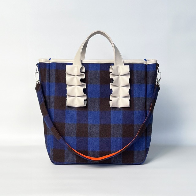 〈フリルハンドル3wayトートバッグ〉 ■価格 29,700円 税込 (27,000円 税抜) ◾️カラー [ブルー] 複数の色の糸が織り混ざった奥行きのある柔らかい風合いの色味です 裏地:オレンジ ◾️ポイント ・お仕事でも使えるような、書類等を入れやすい機能性とスマートに持てることと、可愛さも忘れないバッグを作りたいと思い製作しました。 ・PC対応のサイズでお仕事使いに、荷物が少なめの方なら一泊のお出かけも可能なサイズです。自転車使用の方にも。 ・ショルダーベルトは、①ワンハンドル肩掛け用と②斜めがけ用とで、長さの異なるものが2本付属します。荷物が重くなることを想定し、重量を抑えたいことと肩当たりが良いことを重視し、長さ調節金具を使用しないことにしました。 ・シーンやファッションに合わせて持ち方のスタイルを変えてお楽しみいただけます ・幅4cmのショルダーベルトは、外側はファブリックで当たりが柔らかく、芯にはナイロンを使用することで強度を加え、肩にかかる負担を軽減します。 ・斜めがけ用のショルダーベルトは、デザイナー身長159cmで、腕を伸ばした時にバッグの底に手が届く長さに設定しています。 ・荷物の仕分けを考え、大きめ内ポケットが2個付いています。 ・スナップ付のポケットは、背面幅サイズで深さが底まであり、A4クリアファイルがちょうど収まります(ピッタリです!) ・ファスナー付のポケットは、口が25cm深さが19cmです。 ・上部には蓋面+ファスナーが付いています。 ・蓋面を表裏面幅サイズにすることで、マチのある荷物を入れた際に収まりが良く、 ファスナーの長さは40cmと余裕を持たせることで、荷物を入れる際にファスナーによる荷物幅の制限がありません。開けたままでの使用もしやすくなります。 ◾️素材 (表地)ウール70% ラムウール30%、芯材 (裏地)コットン100% (ショルダー)表地:ウール70% ラムウール30%、裏地:コットン100%、芯:ナイロン ■サイズ 幅 30cm(内寸最大37cm) 高さ 33cm マチ 10cm 持ち手の長さ 23cm ショルダーベルト①の長さ(金具含む) 70.5cm ショルダーベルト②の長さ(金具含む) 101.5cm 重さ(本体) 547g 重さ(ショルダーベルト①) 72g 重さ(ショルダーベルト②) 91g ◾️詳細 上部ファスナー有 ポケット::内2個 ................................................................................. ○商品画像は、出来る限り実物の色味に近くなるよう心がけておりますが、光の当たり具合やスマートフォン・パソコンなどの閲覧環境により、実物と色味が異なる場合がございます。