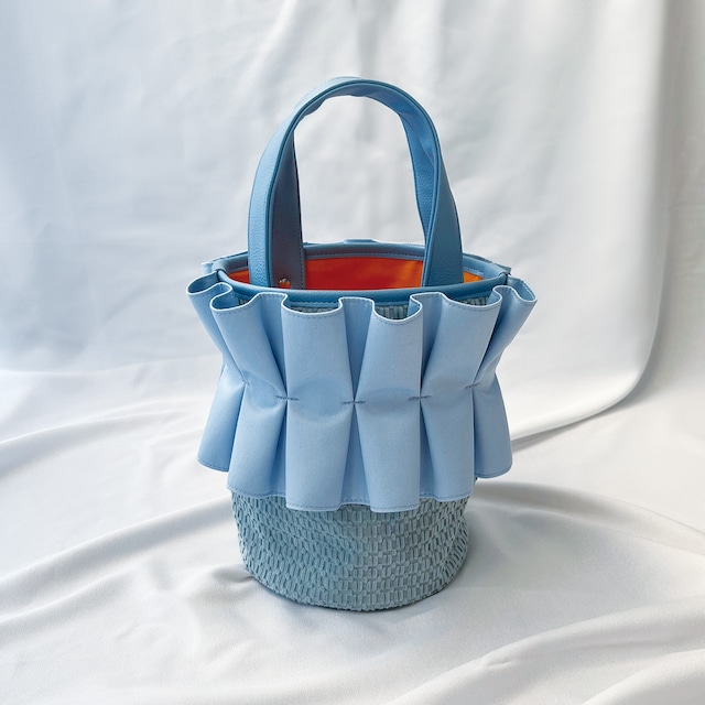〈フリルハンドバッグ〉Corduroy Light blue ■価格 18,150円 税込 (16,500円 税抜) ◾️カラー [Corduroy Water blue] 裏地:ブライトオレンジ ◾️ポイント ・ハンドルが2本のバケツバッグは安定感のある持ち心地 ・太めのハンドルで、腕への負担を軽減 ・フリルは、しなやかな芯材を包んでおり、ハリがあり形の崩れにくい質感 ・長財布や500mlペットボトルが収まる ・デニムスタイルからドレッシーなスタイルまで使い勝手の良いデザインです ◾️素材 (表地)コットンコーデュロイ、ポリエステルコットンフリル、撥水帆布(裏地)コットン(持ち手)合皮 ◾️サイズ 幅 16cm 高さ 22cm マチ 16cm 持ち手の長さ 28cm 重さ 289g ◾️詳細 ポケット::内1個 長財布収納:可(縦向き) ................................................................................. ○商品画像は、出来る限り実物の色味に近くなるよう心がけておりますが、光の当たり具合やスマートフォン・パソコンなどの閲覧環境により、実物と色味が異なる場合がございます。