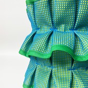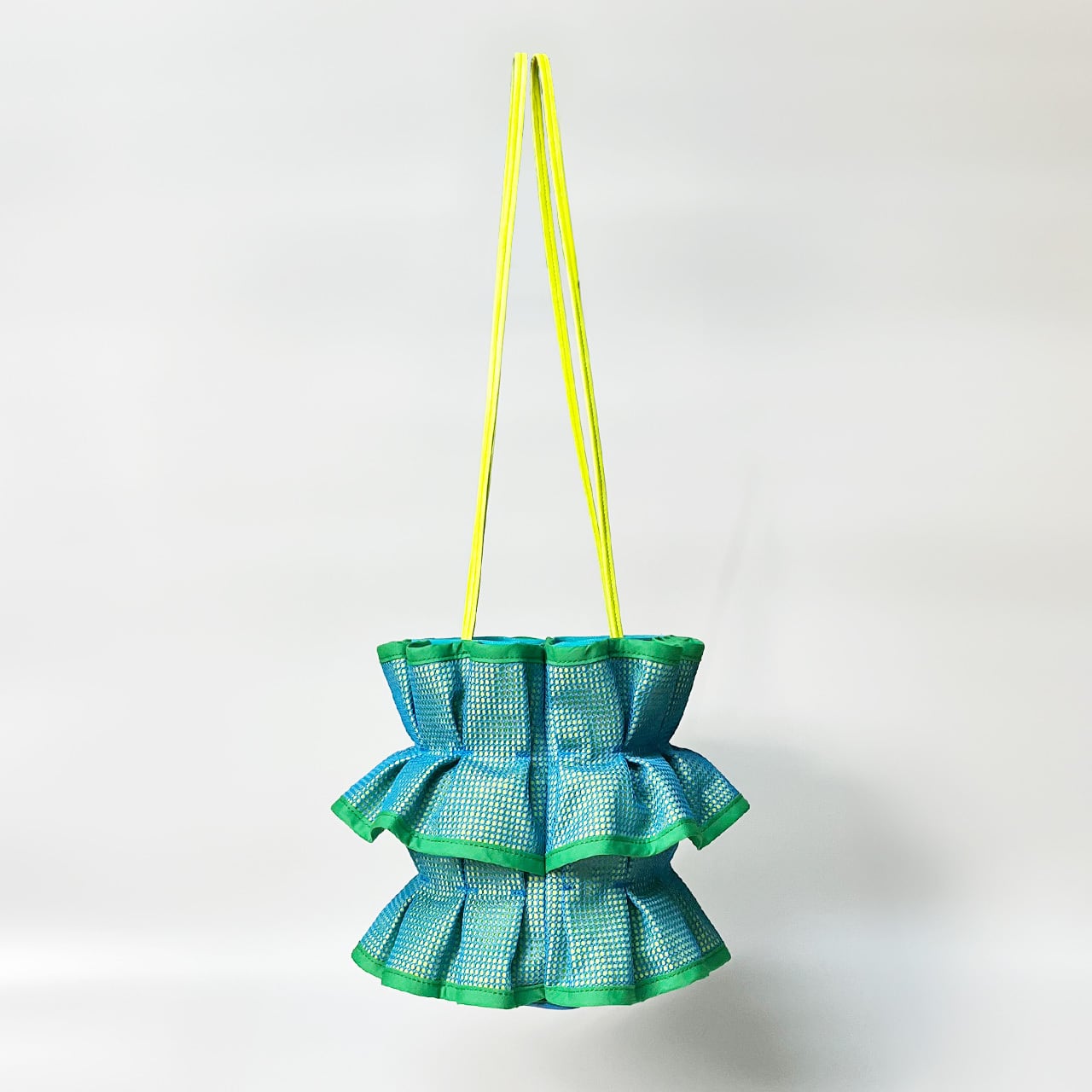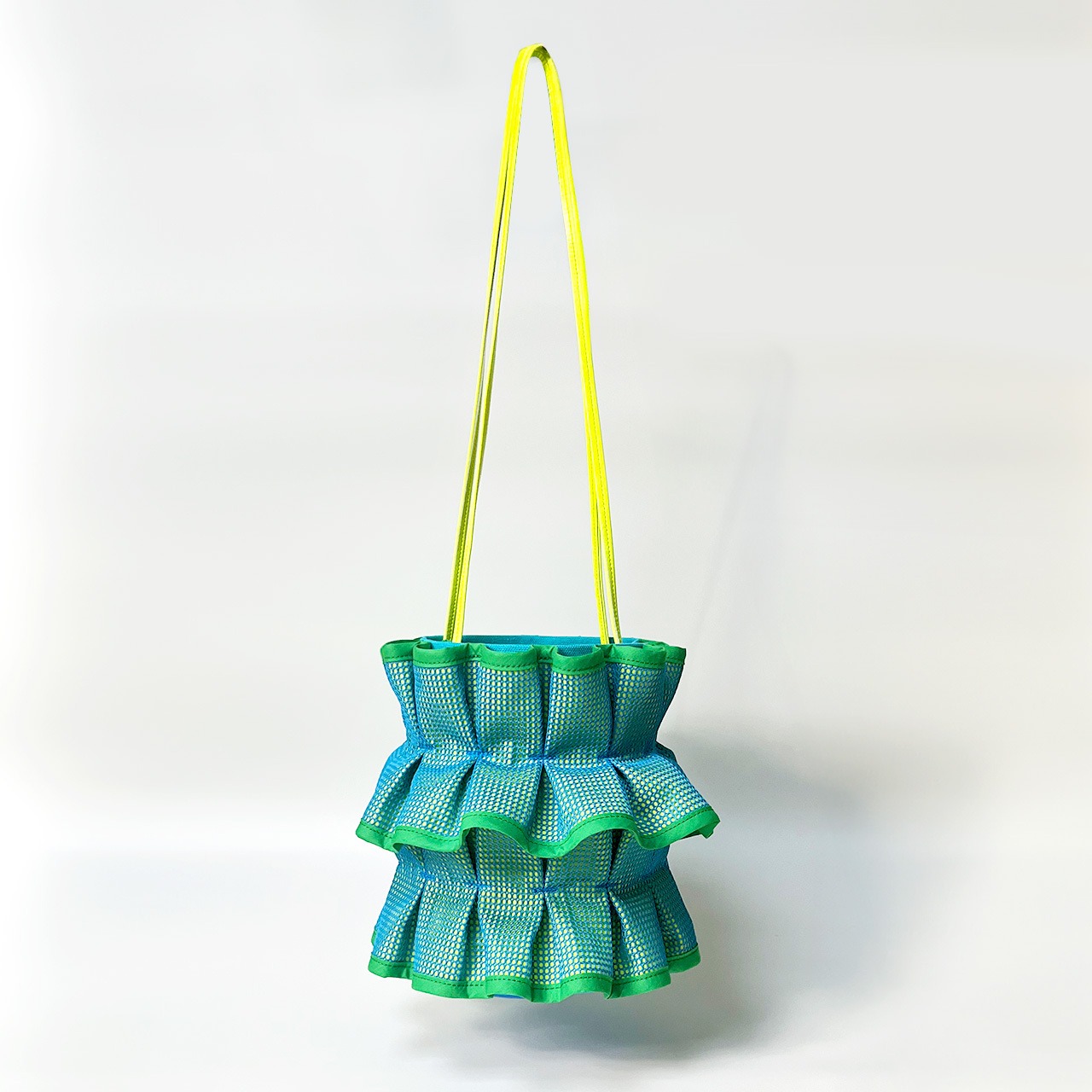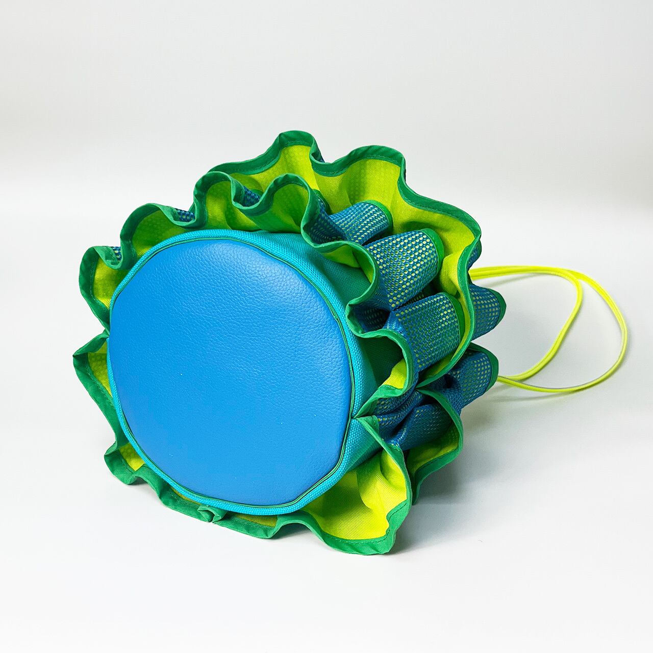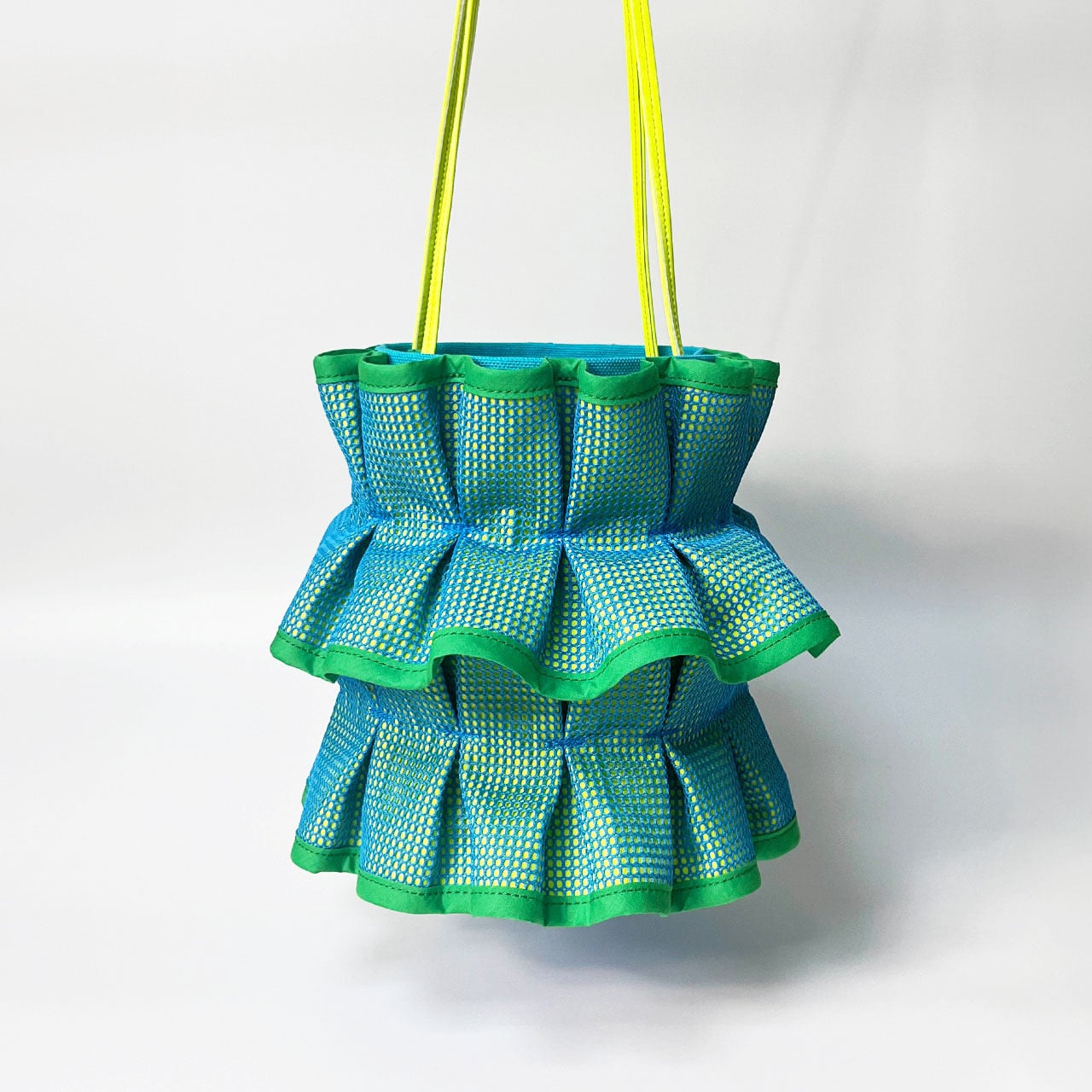 (フリル)ポリエステル、コットン(胴)撥水帆布(底)合皮(裏地)コットン(持ち手)本革